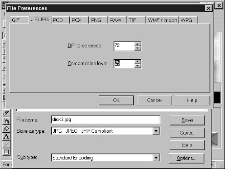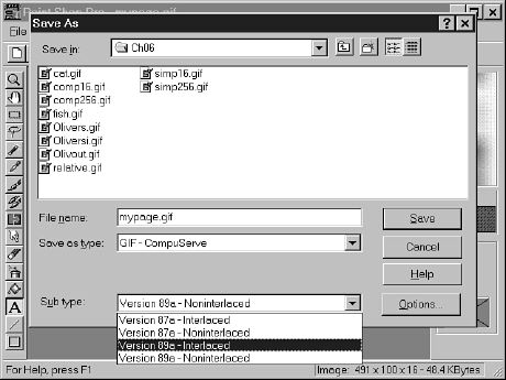 Most graphics programs that can handle GIF files enable you to choose whether to save them interlaced or noninterlaced. In Paint Shop Pro, for example, you can choose the Version 89a-Interlaced Sub type on the Save As dialog box, just before you save a GIF file (see Figure 10.8). To save a progressive JPEG file, choose the JPG-JPEG-JFIF Compliant image type and the Progressive Encoding Sub type. Figure 10.8. Paint Shop Pro lets you save interlaced GIF images, which appear to display faster when loading.
