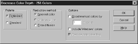 When you reduce the number of colors in an image, you will see a dialog box with several choices (see Figure 10.7). For Web page images, you will almost always want to choose an Optimized palette, and Nearest color instead of Error diffusion or any form of dithering. Figure 10.7. Reducing the number of colors in an image can dramatically decrease file size without changing the appearance of the image much.