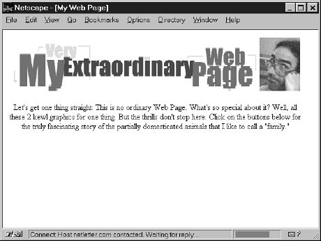 Figure 10.9 shows a Web page with a title banner saved in the interlaced GIF format being downloaded from the Internet. Notice that the banner appears blocky. If this weren't an interlaced GIF, only the top half of the image would be showing at this point in the download. Figure 10.10 shows the same page a few seconds later, when the download is complete. Figure 10.9. The banner at the top of this page looks blocky because the interlaced GIF file isn't done loading yet. Figure 10.10. The same page as in Figure 10.9, after all images are done loading.