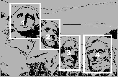 You could use the image in Figure 15.1 as an image map, linking to four Web pages about the presidents immortalized on Mount Rushmore. To do so, first jot down the pixel coordinates of the top-left and bottom-right corners of each rectangular region shown in Figure 15.2. (Just write the coordinates on a piece of paper for now. You'll see exactly how to put them into an HTML file momentarily.)