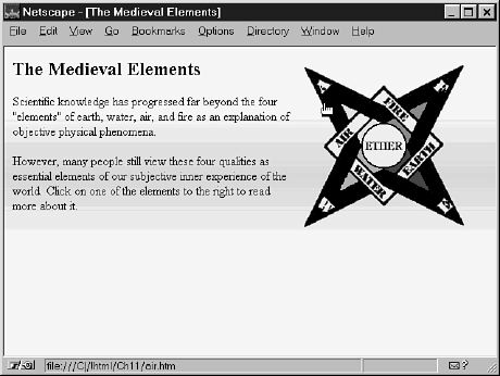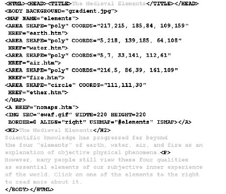 Fortunately, HTML image maps let you create polygonal regions with any number of corners. You can also define circular regions, which would be handy for the "ETHER" region in Figure 15.5.