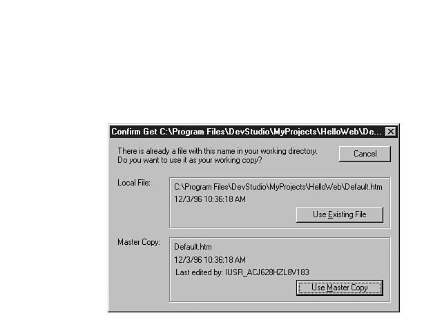 and places the file in the working directory of the client machine. Visual InterDev provides visual cues to indicate the status of the file. The icon