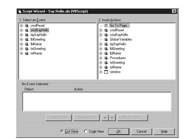 You should be looking at the same window that is shown in Figure 4.24. Adding code using the Script Wizard. The Script Wizard enables you to choose controls and related events and associate