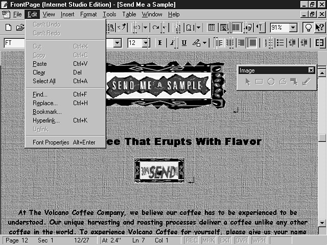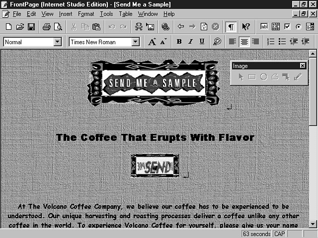 <TD>. The FrontPage Editor generates these tags for you. Figure 5.1 illustrates the power of a visual environment to view your web pages. The FrontPage Editor. This figure shows the Volcano Coffee Company sample web site that's included with