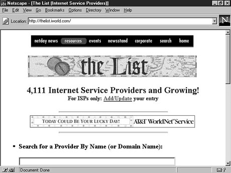 I'll try to answer these questions and more as you go in search of an Internet service provider. Types of ConnectionsThis section explains the different connection options available to you. The one you use--modem, ISDN, cable modem, T1 line, or T3 line--depends on many factors, with cost being one of the greatest determiners. ModemsA modem is an electronic device that converts computer data into audio signals. These audio signals can then be transmitted over a normal phone line. At the receiving end, another modem converts the audio signals back into computer data. Modems can be internal, part of the original computer system, or purchased as external components. On either configuration, you have a jack for connecting your phone line and the data line from your computer. You also have to install special software on the machine to dial out with the modem connection. The speed of a current modem is measured in kilobits per second (kbps). The most common speeds are 14.4 and 28.8 kbps. Modems running at 33.6 kbps are currently available, although not many ISPs are capable of supporting this speed. ISDNISDN stands for Integrated Services Digital Network. ISDN lines are connections that use ordinary phone lines to transmit digital instead of analog signals. With digital signals, data can be transmitted at a much faster rate than with a traditional modem. ISDN converts audio signals--your voice, for example--into digital bits. Because bits can be transmitted very quickly, you can get much faster speed out of the same telephone line--four times faster than a 14.4 kbps modem, in fact. In addition, ISDN connections are made up of two different channels, allowing two simultaneous "conversations"; you therefore can speak on one channel and send a fax or connect to the Internet over the other channel. All these transactions occur on the same ordinary phone line currently plugged into your telephone. Your local telephone company can tell you if ISDN is available in your area. ISDN is a powerful tool for Internet communications, but it is not available everywhere. Traditionally, it has been used in urban business zones and large corporate settings with special digital switching equipment, but residential ISDN service is expanding rapidly. If you're shopping for an Internet service provider that offers you ISDN, be sure to consider the equipment costs. An ISDN line can offer you inexpensive, high-bandwidth connections, but you may have to buy special hardware that will allow ISDN to communicate with your home or corporate machines. Cable ModemsCable modems may be the next great leap in "at-home" connection solutions. It would be great to have the speed of the T1 line you may have at work available to your home PC. Even if you dial in to your office you are still held to the speed of the modem connected to your computer using the normal phone lines. Enter the cable modem. Your computer is hooked not to your phone line but to your coaxial television cable. Cable modems are targeted toward the Internet enthusiast with the need for speed. According to some accounts, the fastest cable modems will be capable of receiving data at 10 Mbps and sending it at 768 Kbps. The suggested fee for that cable-modem service may fetch about $30 to $40 monthly. Including the $600 price tag on the modems themselves, this will be one substantial upgrade that many veteran Net surfers are willing to make. Getting your hands on the hardware may be the easy part. Only certain areas are experimenting with the use of cable modems, but their use is rapidly expanding. Contact your local cable company to see whether it is planning to carry Internet access with cable modems. T1 LineA T1 line is a high-speed digital connection capable of transmitting data at a rate of approximately 1.5 million bits per second. A T1 line is typically used by small and medium-sized companies with heavy network traffic. This line is large enough to send and receive large text files, graphics, sounds, and databases instantaneously, and it works at the fastest speed commonly used to connect networks to the Internet. Sometimes referred to as a leased line, a T1 line is basically too large and too expensive for individual home use. T3 LineA T3 line is a super high-speed connection capable of transmitting data at a rate of 45 million bits per second. This connection represents a bandwidth equal to about 672 regular voice-grade telephone lines. A T3 line is wide enough to transmit full-motion, real-time video and very large databases over a busy network. A T3 line is typically installed as a major networking artery for large corporations and universities with high-volume network traffic. The backbones of the major Internet service providers, for example, are made up of T3 lines. Ten Questions for Your ISPIf you're treading into an unknown area trying to