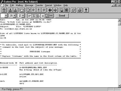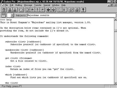 So how do you tell which way the listserv you've subscribed to is set up? Easy. Simply compose a reply to a listserv message. When you do, look at the information your e-mail client puts in the To: field. If a reply goes to the listserv address, as in Figure 8.4, the listserv is set up in the standard way. If the reply goes to the individual, the second type of listserv setup is used. Most listservs are set up to have replies automatically sent to the entire listserv. Listservs Helping ListsurfersOne of the best places to go for help in finding out what user options your listserv offers is the listserv itself. To get help, try the following steps with a listserv to which you are currently subscribed. To Do: Finding Help1. Send a new e-mail message to the address of the listserv or listserv administrator. This address is the same one you sent your subscription message to.2. Leave the Subject: field blank. 3. In the body of the message, type help. 4. If you have a signature attached to your messages, you should turn it off when sending this message. 5. You should get a message after a few seconds; it should look something like Figure 8.5. Again, the amount of time it takes you to get this message back could vary. Table 8.1 lists the most common listserv commands. You use these commands in the body of a message you send to the listserv administrator address. Table 8.1. Common listserv commands.