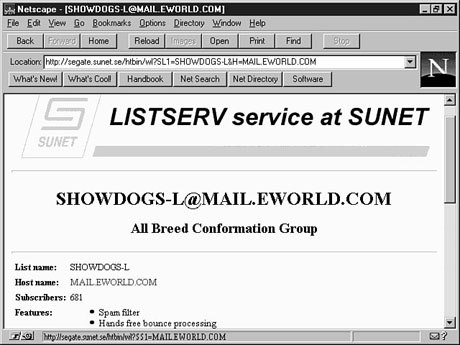 Looking for a listserv about dogs? CataList is the place to go. You cannot get an exhaustive list of every mailing list available with any of these three methods. Using them in combination, however, you are sure to find some listservs you can subscribe to. Signing On and Signing OffThe most important procedures to know when using listservs is how to get onto them and then how to get off. If you know what you're doing, getting on and off is easy. You definitely need to know a few points, however, to make your access of listservs easier. Easy OnAfter you find a listserv, you can subscribe to it. Most listservs are similar in how you can subscribe and unsubscribe. Depending on where you located the listserv you want to subscribe to, you should have specific instructions on where to subscribe. In general, though, you need to complete the same basic steps. To Do: Signing On a Listserv1. Send a new e-mail message to the address of the listserv or listserv administrator.2. Leave the Subject: field blank. 3. In the body of the message, you usually type subscribe Your Name. Some lists require you to type subscribe ListName Your Name. 4. If you have a signature attached to your messages, you should turn it off when sending this message.