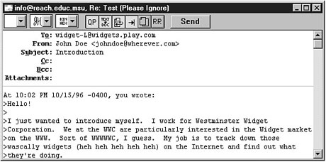 Sending and Responding to MessagesReading, sending, and replying to listserv messages involve the same basic steps as working with any other e-mail. You should know about a few differences, though. I describe these slight differences, along with a few handy rules, in the following sections. Sending Messages to a ListSending a message to an individual is really no different than sending one to a listserv. The only difference is in who receives your message. You can still fill in the To: and Subject: fields, as well as the body of the message. You should keep in mind a few points, however, when sending those messages. To begin, after reading the listserv mail for a couple of days, start by sending a message of introduction to the listserv. Make this message brief, but include information about yourself that might be of interest to other subscribers. Remember, you are hopefully subscribing to the listserv to contribute information as well as get it. The only time you might not want to do this is if you have subscribed to a particularly large listserv with lots of traffic.