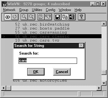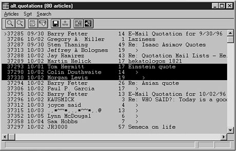 Take a moment to scroll quickly through some of the groups. Quite a few of them, aren't there? At this point, you can simply double-click any group name to read it. After you close the group window, however, your client doesn't save any information about your actions on that group. This way, you can "test out" a group to see if you want to subscribe to it first. Opening up groups before subscribing to them gives you a "snap shot" of what the group is about. You can quickly see that finding a group in which you're interested could take quite awhile if you simply scroll through the list. For this reason, all news clients have a Find option (which also works to find articles within a group). Using this option, you can search the entire newsgroup list for interesting groups. Locate your client's Find function (in WinVN, it's under the Group menu), and begin searching for topics. Figure 10.2 shows a search in progress. Searching for groups is the quickest way to start subscribing to groups. To Do: Searching for Groups1. Get your list of topics from the "Activity" section in Lesson 9.2. Use your client's Search or Find function to locate one group under each topic. 3. As you find a group or groups for each topic, locate the Subscribe to Group option (usually under the same menu as the Find option), and subscribe to each group. 4. Locate the option that enables you to display only groups to which you have subscribed. This option is usually a toolbar button or a menu option; you can generally toggle it on or off to get back to a full group listing at any time. After you locate and subscribe to some groups, you should see a window that looks similar to the one pictured in Figure 10.3. Proceed to the next section to find out what the parts of this window actually mean. This typical group window is displayed in WinVN. News AnatomyYou deal with several different windows when using newsgroups: the Group Listing window, the Article Listing window, and the Article window. The following sections help you discover how each one works. The Group Listing WindowFigure 10.3 shows one example of what a Group Listing window might look like. Generally, this simple window contains two pieces of information: the name of the group and a number. The number represents the number of unread articles in the group. So, the 56 next to uk.rec.cars.classic means that 56 articles appear in that group and haven't yet been seen by the user. As you can see from Figure 10.3, some groups have a lot of traffic (as indicated by a high number), and some groups have less traffic (as indicated by a lower number). Beware of very high traffic groups; keeping up with them can often take a lot of time and money. The Article Listing WindowNow you're ready to take a close look at what's inside a newsgroup. What do all these articles look like? For an example, take a peek at Figure 10.4, which shows an Article Listing window. A little confused? Well, read on. This Article Listing window is typical, if initially confusing. Most news clients display a lot of miscellaneous information about each article, such as the time and date it was posted, the sequential number of the article, and how many lines appear in the article. You really need to pay a lot of attention to only two pieces of information, however. First is the poster, which is usually a name (real or made up) of the person who posted the article. Second, you should see the subject of the article. With this second area, most confusion arises. All newsgroup articles combine to make what is called a thread. A thread is basically nothing more than a number of articles that all deal with the same subject. Just like many cloth threads make up a piece of clothing, so too do many article threads make up a newsgroup. New Term: Thread: A thread is a series of articles all dealing with the same topic. Someone replies to an article, and then someone else replies to the reply, and so on. This organization of original topic articles and replies makes up a newsgroup thread. Notice that several articles are highlighted in Figure 10.4. The first article has a subject, whereas the other two articles simply have a > indented at various levels. This setup indicates a typical small thread. The article with the subject is the original available article in the thread. The article with the > indented once is a reply to the original posting, and the article with the > indented twice is a reply to the reply. Even though this example is simple, threads can get very complicated. With a little time and practice, you'll get used to them. The Article WindowFrom the Article Listing window, you can double-click any message to read it. When you do, you see a window similar to the one pictured in Figure 10.5. The information in this newsgroup article should look familiar to you. Experiencing a little deja vu? Well, you should be. Newsgroup articles are similar to e-mail messages. They both contain headers with lots of technical information about the article and bodies with the actual text of the article. Much like e-mail headers, most news article headers can be ignored. You should, however, pay attention to several headers: