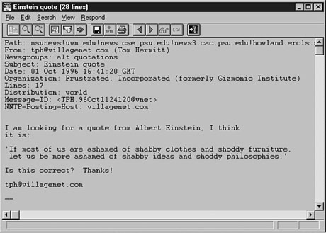 In the body of the message, notice that, like e-mail, the original article is included, with each line preceded by an include mark (>). As with e-mail, you can select and edit the original article's text in any way you want. After your reply is complete, select the Post or Send option. The next time you read the group, you should find your reply in the list of articles. Managing NewsgroupsAs you have already seen, newsgroups can contain a lot of traffic and can get quite complicated at times. For this reason, you need to be able to manage newsgroups effectively. Most of your newsgroup management will consist of making sure that you keep your .newsrc file up-to-date. Failure to do so can result in a lot of wasted time and effort. New Term: .newsrc file: A .newsrc file contains information about your newsgroups, such as which groups you're subscribed to and how many articles (both read and unread) are in each group you subscribe to. Most other news clients have somehow managed to keep this term, which is actually used by UNIX newsreaders. You maintain your .newsrc file by marking a group or article as read, which is also called "catching up" by some news clients. You can use the following procedure to manage your groups: To Do: Managing Groups1. Choose a group to read.2. Browse the group until you have read, posted and replied all you want. 3. Find the Catches Up or Marks Articles As Read menu option or toolbar button, and select it. 4. Go to the next group and repeat this process. Most people manage groups this way. Failure to catch up a group means that, the next time you read news, you'll have to sort through articles you have already read. Especially with high-traffic groups, having to re-sort can get messy really fast. The following are a couple of final notes on group management: