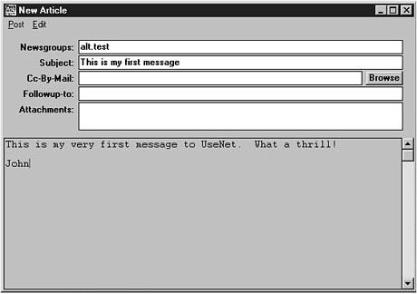 Posting, Replying, and Managing NewsI can hear you screaming, "Enough explanations already!" Okay, okay, you can post some news now. First, a piece of advice: Using your client's Find option, locate and subscribe to the newsgroup alt.test. This newsgroup is set up specifically to accept test messages. If you make a mistake posting or replying to articles in this group, no one cares. After you practice here awhile, you can post some real articles to those groups you've been lurking on. Posting ArticlesAs a rule, with most news clients, you can post new articles from either the Group Listing or Article Listing windows. Generally, selecting the Post New Article option from within an Article window results in a reply to that article, which I talk about in the next section. For now, here's how you can post your first article. To Do: Posting Articles1. From either the Group Listing or Article Listing window, choose the New Message option for your client.2. Type in a Subject: and which newsgroup (alt.test, in this case) to which you want the article posted. 3. Click in the body of the article composition window, and type a short message. It should look something like the message shown in Figure 10.6. 4. Finally, click the Post or Send button (or choose the corresponding option). Congratulations! You have posted your first article to Usenet. Don't worry if it seems that you did not fill in a lot of the header information; your client provides such details to the news server automatically. The next time you retrieve the new articles for alt.test, search for your article; new articles generally appear on the group within several minutes. A newsgroup article looks almost identical to an e-mail message. Replying to PostsAnother type of post is the reply. Again, the similarities between replying to a post and replying to e-mail are striking. With the exception of the Newsgroup: header, the process is almost identical. You can generally reply to a post from either the Article Listing window (with the article you want to reply to selected) or from the Article window itself. Look at the header for just a moment before replying to the article. Your client provides all the information you need to post your reply.
