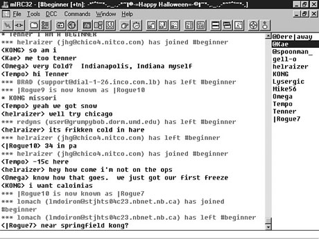 Just like computers themselves are changing, so is Internet Relay Chat (IRC). What was once only a text-based system is evolving into a graphical interface. The blank text screen is becoming a new client, complete with Windows elements and 3-D virtual reality interfaces. What Is IRC and How Does It Work?Internet Relay Chat, or IRC, is a multiuser version of a program called talk. Talk allowed only one-to-one conversations, so it was pretty limited. Using IRC, large groups of people can simultaneously participate in discussion groups, called channels. IRC was developed in the late 1980s by Jarkko Oikarinen. It consists of a network of chat servers located all over the globe. Each server is connected via the network, allowing users to have real-time communications. A user's message is instantly viewed by all the other guests in that channel. IRC poses no restrictions to the number of users. Tens of thousands of people connect to IRC everyday to discuss everything from world news to what they had for dinner last night. If you can't find a channel for your topic of discussion, you can always start your own. Although most conversations that take place on IRC are thought of as frivolous, some have notable value. During the 1991 Persian Gulf War, IRC was used to gather eyewitness accounts of military activities. A special channel was created so that users from all over the world could join and hear the latest news reports. A similar application of IRC was used in September 1993 when the coup against Boris Yeltsin began. Again, users gathered on IRC channels to hear live reports of the situation. IRC gained U.S. appreciation when the 1994 California earthquake hit, downing phone lines and inhibiting news of what had happened. Within 20 minutes of the aftershocks, two new channels were created on the IRC to handle questions and accounts of the earthquake. Actually, a few separate networks make up IRC. The two biggest are EFnet and Undernet. Some channels are shared by both, whereas other channels reside on only one of the networks. Because of the network connections to either EFnet or Undernet, you don't have to connect to the same server every time. Try connecting to the one that is geographically closest to you. Doing so may make your connection faster. ClientsNow that you know a little about IRC, you should examine the software needed. IRC originally used only text-based clients developed on UNIX machines. Today, however, many users have traded in the text client for a more user-friendly Graphical User Interface (GUI) client. GUI clients use buttons, pull-down menus, and selection tools to replace some of the frequently used commands within the IRC client. Buttons for emotions and actions can now replace the normal code syntax. Later in this lesson, I describe three of the most-used clients to access IRC. Take the time to try out one of them. Many new users feel more comfortable using a GUI interface, so you might like it. ChannelsChannels on IRC are much like channels on a CB radio. Each channel has its set topic of discussion. All users on that channel can participate in any discussion that is being carried on. Generally, multiple discussions are carried out simultaneously across any given channel. A channel has the image of a big party atmosphere--lots of people talking, everyone trying to hear the person next to him or her while picking up fragments of other conversations. After you enter a channel, you should wait until you gather an idea of what conversations are covered before you try to jump in. Users find it rude for a new person to invite himself or herself into a conversation, so you may want to lurk (stand on the sidelines and watch) and wait to be invited to join the discussion. Take that chance to familiarize yourself with the topic and level of the dialogue. Afraid no one will know that you entered the channel or room? Fear not! All the users are automatically notified if a new user enters and if someone leaves. How embarrassing to talk to someone who wasn't there anymore. CommandsIf you're going to use a text-based IRC client, you need to know a few of the common commands. For more help on IRC commands, try entering /help newuser or /help intro after you are logged on to the IRC. Table 11.1 shows a list of basic commands that will get you started. Table 11.1. Sample IRC commands.