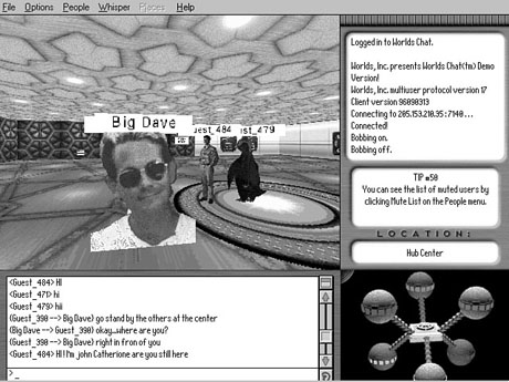 When you visit a Web site that is chat-enabled, like the one shown in Figure 11.2, the ichat plug-in configures the browser window for a chat session. The top frame remains for Web browsing, and the bottom contains a real-time chat session of all the visitors to that Web page. A chat session using the ichat plug-in. Remember, when you're visiting a Web site, you can assume that you are the only person reading the pages. Now you can chat with others as you explore a site. You don't have to memorize any special commands. You simply type your message if you want to address the entire group. You can also choose items from the menu bar for special responses as well as send a private message to one user. For users without plug-in compatible browsers, you can configure the stand-alone client to run a helper application. The client is launched whenever an ichat, IRC, or MUD link is encountered on the Web. The ichat Web site has a listing of major servers using the ichat software. A listing of special events that are moderated via the ichat plug-in also is included. Event moderation enables users to contribute to interviews with special guests. The lead moderator forwards questions from the online audience to the guest speaker. Replies to the questions go out on the chat line for all to see. Audio and video broadcasts may also be possible through the integration of a capable browser. Worlds ChatVirtual reality hits IRC, and Worlds Chat is born. Worlds Inc. (http://www.worlds.net) recently released the production version of their 3-D IRC client. Worlds Chat is just one of the new generation of IRC clients that use 3-D graphics and VRML to transport users to new arenas. Imagine experiencing a leisurely stroll with your virtual friend, hearing the babbling of a nearby brook and the chirping of birds overhead. You converse about your recent metaphysics journey. At a moment's notice, you take flight over your three-dimensional world, leaving your friend as he watches you hover above. Worlds Chat goes beyond the traditional flat screen of text and pictures to deliver a realistic experience. You can interact and "see" thousands of other real users in hundreds of different worlds. You navigate through 3-D virtual worlds suited as your persona, or avitar. Worlds Chat offers over 40 different avitars for you to choose from. Your avitar represents you while you communicate to other users in the virtual world. These personas range from seven-foot tall penguins to four-headed aliens, whichever fits your spirit at the time. You can even provide your own custom avitar, as shown in Figure 11.3. Big Dave's avitar is a little more original than the seven-foot tall penguin in the background. With the addition of sound effects and music to highlight the mood of the individual worlds, scenes take on a new excitement. The central space station, known as the Hub, connects you to the seven environments within the Worlds Chat arena. The Worlds Chat Gold is currently in its 1.1 version. A trial version is available on the Internet. This version, however, does not have the full functionality of the Gold version but will provide you with the basic experience. MUDs, MOOs, and Other InteractionsMultiuser Dungeons, or MUDs, could be considered computer adventure games. As the user, you are placed in a network of rooms and passages. These rooms contain other players, as well as valuable items to help you in your quest. The ultimate prize is to gain the class of wizard.