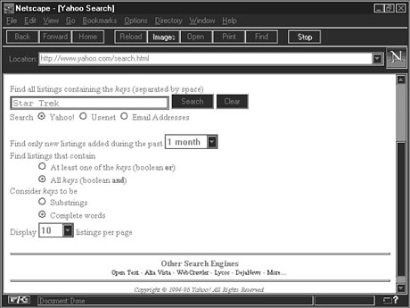 you can search the World Wide Web, Usenet newsgroups, FAQs, e-mail addresses, and more.