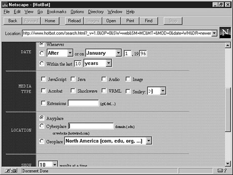 can see in Figure 16.7. With Hot Bot, you can restrict your search by time, location, and