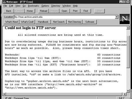Many FTP sites restrict use to certain times of the day and to a particular number of users. The wide range of files on anonymous FTP sites means that something really is available for everyone. From novices to experienced programmers, you can find something for you.