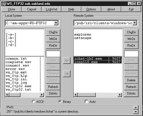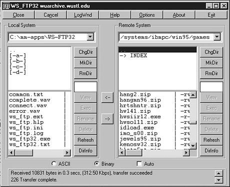 Downloading FilesI've given you all the pieces. Now you're ready to put them together and download that first file to your hard drive. Starting out with something easy, like a decompressed text file, is probably a good idea.