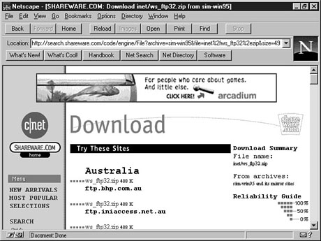 To Do: Downloading Files1. Point your client to mirrors.aol.com (FTP client) or ftp://mirrors.aol.com.2. Take the directory path /pub/music/lyrics/d/dire.straits/. 3. Choose one of the albums listed, and download it to your computer's hard drive. 4. Open a word processing program. 5. Open the file you just saved to your hard drive and view it. Next, download something useful. You may have already glanced at Appendix B and noticed that WinZip is listed as a great utility for decompressing files. Well, why don't you go ahead and download the latest demo version right now? To Do: Downloading the Demo1. Point your FTP client (or Web browser) to ftp.winzip.com.2. Take the directory path /winzip/winzip/. 3. Choose one of two files to download at this point. If you have Windows 95, choose winzip95.exe. If you have Windows 3.1, choose wz16vXX.exe (where XX represents the most current version). 4. Download the appropriate file to your hard drive. 5. Choose File|Run (in Windows 3.1) or Start|Run (Windows 95) to run the file you just downloaded. 6. Choose the WinZip Setup option, and follow the directions to set up WinZip. Time Saver: If you are using a Mac, you might want to go ahead and download StuffIt Expander. Simply go to http://www.aladdinsys.com/consumer/expander2.asp and follow the instructions provided on the page. Browser Versus ClientProbably the biggest choice you face when using FTP is the software you'll use. You have two basic choices: a Web browser or a client designed specifically for FTP. Each solution has its own drawbacks, but you should carefully consider a few factors. UsabilityThe first issue is that of usability. For ease of use, a browser wins hands down. Using either Netscape or Internet Explorer, the process of finding and downloading files is as easy as browsing the Web--everything remains point-and-click. You can use a Web site, such as http://www.shareware.com/, to find the files and then click your way to the file you want to download. Figure 17.5 shows such an example. Browsers offer you Web ease for finding and downloading files. I'm not saying that FTP clients are hard to use--they really aren't. However, figuring out exactly how to use these clients definitely takes longer. Also, your using FTP clients doesn't mean that you can't still use a browser to find files--you can. In fact, many FTP pros regularly use the strengths of both browsers and FTP clients to get files quickly and efficiently. FlexibilityThe second real issue to consider when choosing a browser versus a client is flexibility. How many different tasks a browser or client can perform is also of utmost importance. On this measure, the FTP client wins without question. For the most part, using a browser, you can find, download, and upload files, and that's about it. A client, however, offers an entire world of functionality. Many clients, such as WS_FTP for Windows and Fetch for Macintosh, actually act as miniature file managers as well as FTP clients. You can usually change download directories and filenames, delete files, and download multiple files all from one piece of software, as you can see in Figure 17.6. Often, you can also view and even launch files right from within the FTP client. Do you want to save some time by downloading several files at once? Don't use a Web browser! You will probably find yourself using both a browser and a client to use FTP. For many everyday FTP tasks, a browser works fine. For the times you need a more powerful tool, you may want to take advantage of what an FTP client has to offer. SummaryIn this lesson, you learned about what FTP is and how it works. Now you know that two different types of FTP sites exist, one of which (anonymous FTP sites) you can access to get all types of files, documents, and software. You also learned how FTP sites are organized so that you know how to find, explore, and get what you want. Finally, you learned how to download files using FTP, as well as some of the pros and cons surrounding what type of FTP software to use. WorkshopThe following workshop helps solidify the skills that you learned in this lesson. Q&AQ I know that all this great stuff available via
