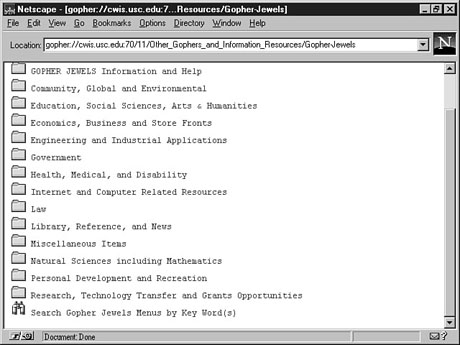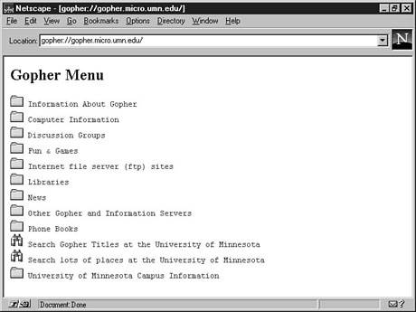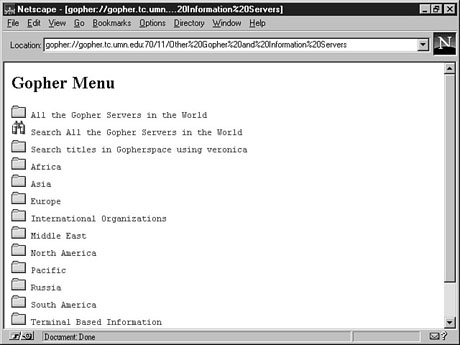 Although you can find Gopher clients, such as WSGopher for Windows and TurboGopher for Macintosh, they are rarely used anymore. Browsers such as Netscape and Internet Explorer can access and use the information on Gopher well. Is Gopher Just Another Rodent?Besides being a cute little animal and the mascot for the University of Minnesota, a Gopher is another type of site on the Net that is full of information. In fact, it's no accident that this type of Internet site bears the name of this northern university's mascot. Gopher was originally developed at the University of Minnesota in the 1980s to solve a particular campus computing problem. A typical large university, U of M contained many departments with many files that different people needed to share and access. They still needed to make this information easy to access and controllable by each department, however. Enter Gopher. A system was developed whereby many types of information could be displayed and accessed in a simple, menu-based structure, as shown in Figure 18.1. In fact, the University of Minnesota defines a Gopher as "software following a simple protocol for tunneling through a TCP/IP internet." The Mother of all Gophers is located at the University of Minnesota's site (gopher://gopher.micro.umn.edu). For the first time ever, users could access useful information by selecting menu items that were actually in English (if you can imagine that). Soon others saw the usefulness of this helpful system. Where Should You Start?A great place to start using Gopher is actually at the University of Minnesota's Gopher site. Also at Minnesota's Gopher is a directory with links to practically every Gopher server in the world. You can locate it at the following URL: gopher://gopher.tc.umn.edu:70/11/Other% Time Saver: If typing in a URL like the preceding one gives you goose bumps, you can go about it in an easier way. From U of M's Top Level Gopher at gopher://gopher.micro.umn.edu, simply click the Other Gopher And Information Servers link and make a guidemark for the resulting page shown in Figure 18.2. This way, you can save a lot of typing. Your link to the entire world of Gopher starts at the University of Minnesota. As you can see, this Gopher gives you the opportunity to go to an alphabetical listing of every Gopher server in the world. In addition, you can look at Gopher servers by region or even conduct a search for and of different Gopher servers worldwide. What's Gopher Really Like?You already know that Gopher sites consist of menus that contain information, but what are some of the specifics involved in navigating Gopherspace? The first thing you need to do is learn how to recognize when you're using Gopher. New Term: Gopherspace: Gopherspace is simply the term used to describe the portion of the Internet that contains Gopher sites. It is one of cyberspace's subdivisions, if you will. If you're navigating the Internet using a Web browser, you may not always realize when you've left the Web and entered Gopherspace. You can look for a couple of telltale signs. First, if you have your browser display the location, you can see that a Gopher site's location begins with gopher://. Second, notice the line-by-line menu structure for which Gopher is known. Gopher sites can often look similar to FTP sites in a browser, but just remember that FTP menu items rarely consist of English words and headings. Burrowing in GopherNavigating Gopherspace using a Web browser is easy. In fact, it's really no different from navigating the Web. Every menu item in Gopher appears as a hyperlink in your browser. Simply click a menu item to proceed to the next one. Much like links on the Web, Gopher links can take you to many different types of resources. Depending on what browser you use, these different links are preceded by an icon or a word to indicate what types of resources the link points to. Table 18.1 gives a breakdown of common Gopher links. Table 18.1. Common Gopher links.