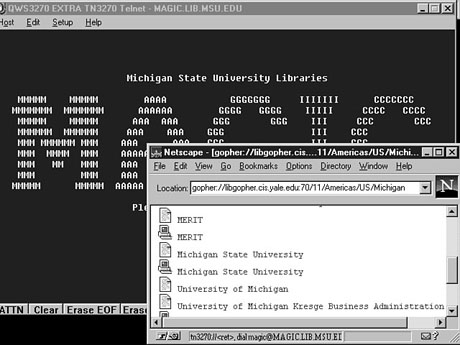 What's on the Menu?Just as navigating in Gopher is similar to finding your way around the Web, the file and directory structure of Gopher is similar to that found on FTP sites. (See Lesson 17, "Getting Files with FTP," for details.) Briefly, every Gopher site has a Top Level menu such as the one shown in Figure 18.1. Each one of these menus then acts as its own "top level" menu for the menus below it. One major difference, however, does exist between Gopher and FTP directory structure. Whereas FTP directories can lead only to other subdirectories and files, Gopher directories can lead to subdirectories and files, as well as search engines, databases, Telnet sessions, Web sites, FTP sites, and other Gopher sites. For a simple example of Gopher menu structure, look at Figure 18.3. The tree-like structure of a Gopher menu can lead you almost anywhere. Just like with FTP, most of your navigation in Gopher consists of clicking hyperlinks and using the Back and Forward navigation buttons frequently. What Can You Find on Gopher?I mentioned at the beginning of this lesson that a lot of useful information really is available via Gopher. If you burrow around Gopher, you will begin to find some of the menus and files that make Gopher a good source of information to this day. As you will learn in Lesson 20, "Finding People, Places, and Things on the Net," you can search Gopherspace using Veronica to find even more information on Gopherspace. In addition, in the following sections I show you a couple of the resources to which Gopher can give you easy access. Using Gopher to TelnetAs you will learn in Lesson 19, by using Telnet, you can connect directly to other computers on the Internet. One thing you won't learn in that lesson, however, is one particularly easy way to find some of the most useful Telnet sites on the Net, as you learn next. Gopher is an excellent resource for locating public access Telnet sites on the Internet. Foremost among these sites are libraries. Many large libraries have their card catalogs and holdings available for searching on the Internet. These libraries, with the help of Gopher and Telnet, can offer you a wealth of information. To Do: Telnetting1. From the University of Minnesota's home Gopher at gopher://gopher.micro.umn.edu, click the Libraries link.2. Click Library Card Catalogs via Telnet. 3. Click the Library Catalogs from Other Institutions link. 4. Follow the Americas/United States/Michigan/ link. 5. With your Web browser configured with a TN3270 Telnet client (see Lesson 19), go to the Michigan State University library.
