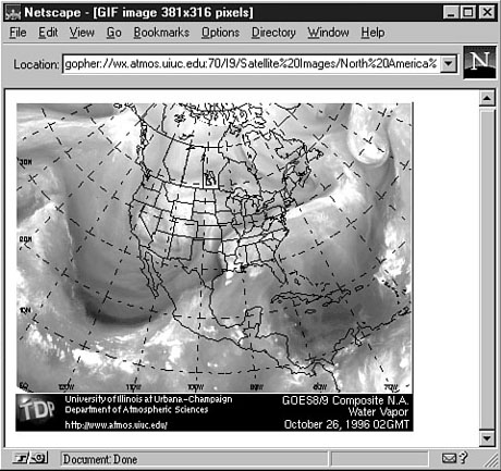 Figure 18.4 shows how your Web browser automatically brings up the appropriate application to get you into just about any library you want. Before going on, you may want to browse around the MSU MAGIC online library for a while. On your way to finding this library, notice that you passed hundreds more. MSU MAGIC online library is a great place to start if you need to do library research of any kind. When it comes to Telnet, you need two applications to get connected. Gopher JewelsAs you now know, Gopherspace consists of millions of interconnected menus and files. What you may not know is that another attempt has been made to make Gopher sites accessible by topic in an effort to reduce the necessity for complex searches and following dead-end links. This topical organization of Gopherspace is accomplished by Gopher Jewels, a system maintained at the University of Southern California. Getting to Gopher Jewels is easy. From gopher://cwis.usc.edu, click Other Gophers and Information Resources and then click Gopher-Jewels. You then see a screen like the one pictured in Figure 18.5. Spend a little time exploring these topical menus. Notice that each submenu enables you to jump to a previous menu or search Gopher Jewels. This capability gives you one more way to use Gopher powerfully and efficiently. Gopher Jewels offers topical access to Gopherspace. Gopher Examples, Please?You now have several different ways to explore much of the useful information that is on Gopher. Before you're done, though, perhaps you would like to see a few examples of Gopher in action. How's the Weather?Gopher provides a lot of information on the latest in weather, including satellite pictures of recent weather in different areas, as well as complete forecasts. Probably the best place to find current weather forecasts is the Gopher site at Michigan State University. To Do: Checking the Weather1. Go to MSU's home Gopher at gopher://gopher.msu.edu.2. Click News & Weather and then click the Weather links. From here, you can go in one of many directions: 3. For the latest satellite weather images,
