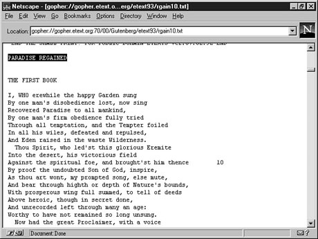 You can then view a wide range of images, as shown in Figure 18.6. Viewing satellite weather is easy when you're using Gopher. "Money for Nothin' and the guides Are Free"One of the most popular literary trips on the Internet, and available through Gopher, is Project Gutenberg. This project has put hundreds of non-ed guides on the Internet in electronic form. Quite a few sites give you access to the Gutenberg E-texts; next, you take a look at one. New Term: E-text: This term stands for "electronic text." E-text is becoming a popular way to put textguides, non-ed guides, and other literature on the Internet. To Do: Viewing E-Texts1. Go to gopher://gopher.etext.org/.2. Click Gutenberg. 3. Click newuser.txt or index.asp to find out more about Project Gutenberg. 4. If you remain on the main Gutenberg menu, you can click any one of the years listed to find the guides published for that year. Click etext93, for example, to find those guides published in 1993. 5. Click one of the INDEX.GUT links to find out what all the funny-looking links actually contain. 6. Click the guide you want to see. You could click rgain10.txt, for example, to take a look at Paradise Regained by John Milton, as shown in Figure 18.7. After you scroll through a couple pages of disclaimers, the guide appears. Obviously, much of the information available on Gopher might also be available on the World Wide Web or other sources. For simplicity of interface and amount of information offered, however, Gopher is a useful tool that Internet veterans still make use of today. SummaryIn this lesson, you learned about Gopher, which was created at the University of Minnesota and grew into a menu-driven worldwide source of information. Next, you learned about how Gopherspace is organized, what types of files you could expect to find, and what are some of the resources available through Gopher. Finally, you looked at some useful Gopher sites in action. WorkshopThe following workshop helps solidify the skills that you learned in this lesson. Q&AQ I can see that Gopher might be useful, but it sure would be nice if there were a way to search for information on Gopher. Is there? A There sure is. But I'm going to keep you in suspense a little longer. If you can't wait, however, you can go to Lesson 20 to find out how to search for more interesting information on Gopher. Q Does Gopher offer any information that really isn't available anywhere else? A Yes. The amount of information that's available on Gopher that may not be available anywhere else, however, is getting smaller all the time. The biggest advantage to Gopher is that many resources (such as libraries, Telnet sites, and other information) are easier to access from Gopher because much of the "clutter" of the World Wide Web isn't there. QuizTake the following quiz to see how much you've learned. Questions1. What's the URL of the first Gopher site? (a) gopher://gopher.micro.umn.edu(b) gopher://gopher.msu.edu gopher://gopher.etext.org 2. Which of these files would you likely not find in Gopherspace? (a) Text files (b) Images Sound files (d) None of the above 3. Gopher sites are practically obsolete. (a) True (b) False Answers1. (a) Remember that the University of Minnesota started it all.2. (d) You can find just about anything on Gopher. 3. (b) False. Some might say that Gopher is obsolete, but it still has way too much good information for it to be obsolete. Of course, for anything new, the Web is the direction everyone is going. ActivityJust to see what really is available in Gopherspace, pick any generally broad topic that you're interested in. Next, go to Gopher Jewels and see what information you can find on that topic.