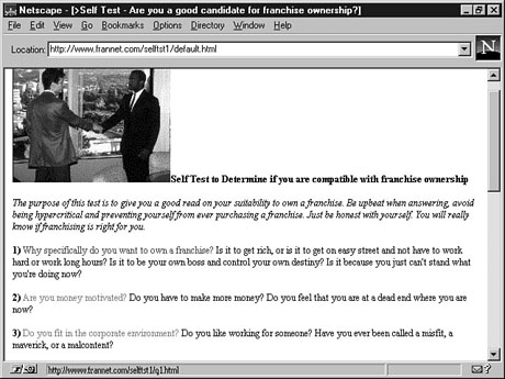 She also visits FranInfo at http://www.frannet.com. At FranInfo, she can get a lot of information about franchises. One of the first things she does is click the Self Test #1 link to see if she actually is suited to franchise ownership (see Figure 23.2). Some people might need to find out if they're cut out to own a franchise. Going to the Next LevelNow that Rea has some beginning information, she's ready to move on. She has heard that there is information on starting, financing, and expanding a business, as well as local small business resources available at the Small Business Administration (SBA) Home Page (http://www.sbaonline.sba.gov). She was right. She even checks out the link on Women In Business available at SBA online. For even more information, she goes to the Dun & Bradstreet Small Business Services page at http://www.dbisna.com/dbis/sbs/hsbs.asp. There, she can get the basics on business management and other practical information for keeping her business going. The Long HaulOf course, Rea has guidemarked in her Web browser the sites she has already checked out because they have excellent information for continuing a business as well as starting one. However, there are a couple of stops she wants to make before she's finished. Her first stop is to check out the Internal Revenue Service (IRS) page at http://www.irs.ustreas.gov. While browsing America's "favorite" branch of the government, she can download forms or get valuable information, including tax information for businesses, at http://www.irs.ustreas.gov/prod/bus_info/. Finally, she wants a little free advertising, so she is going to list her business with the Home Based Business Yellow Pages. To Do: List Your Company in Online Yellow Pages1. Point your browser at http://www.tab.com/Home.Business/yp.asp.2. Click the Submit Listing form link. 3. Fill out the form and click the Send Form button. You now are listed.