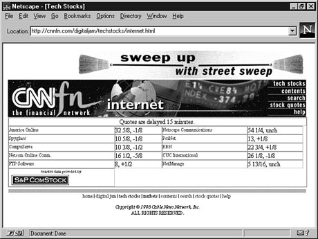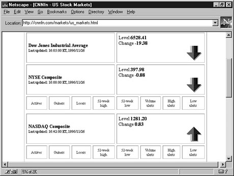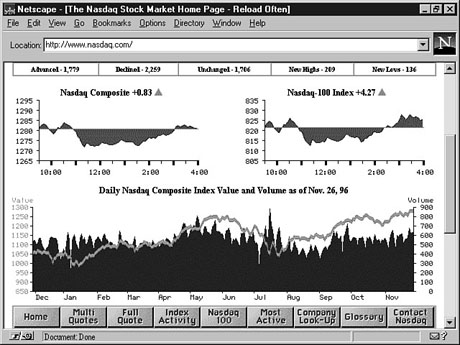 Many people who are interested in finance and business want to keep up with what's happening in all of the financial markets. CNNfn can help here, too. After returning to CNNfn's home page, click the Markets link and then click US Stock Markets. This will take you to a page that will look something like Figure 23.3. Bull or Bear? CNNfn tells you about gainers, losers, volumes, and other valuable information on all the major markets. From the Markets page, notice also that there is information on world stock markets, currencies, commodities, and more. In fact, just in case you are interested in how the Internet is doing in finance, from the Markets page (at http://ccnfn.com/markets/) click tech stocks and then Internet (see Figure 23.4). Hmmm, looks like the Internet didn't do so well on the stock market today. Before moving on, you should note just how much this Web site has to offer; you can do research, get the latest financial news, and look at resources related to your money. All this and more from CNNfn--a must-see Web site for the financially minded. Time Saver: You might want to use CNNfn as your primary source of information on the New York Stock Exchange (NYSE). Although the Exchange does have a Web site at http://www.nyse.com, the site really doesn't have a lot to offer and isn't very up to date. On the day that I found NYSE's close for Tuesday on CNNfn, the Exchange's own Web site's numbers were more than a day behind. The Next Hundred YearsNasdaq recently ran a series of commercials claiming that it's the "stock market for the next 100 years." If Web sites are any indication, the company's commercials might just be right. If you are interested in progressive, cutting-edge stocks such as Microsoft, Novell, Oracle, Sun, Adobe, and Dell, Nasdaq is the place for you. In addition to very current information, links to major companies' Web sites and more, Nasdaq's site offers a very comprehensive number of choices right from its front page (see Figure 23.5). Get multiple quotes, find out what stocks are most active, browse the Nasdaq Top 100 stocks, and more, all from the Nasdaq home page. Find out how the day's trading went, and a whole lot more, from Nasdaq's Web site. The following is a short list of some of Nasdaq's more useful features as accessed from its home page: