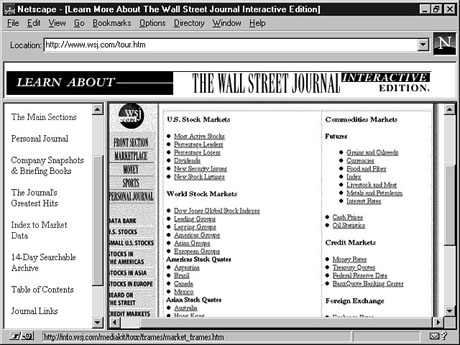 Visit Wall StreetIf you are one of those people who must have the most current information, perhaps you should visit The Wall Street Journal's Web site. For a fee, you can gain access to its Interactive Edition, which will give you 24-hour-a-day updates on financial markets, along with other news. To Do: Visit The Wall Street Journal site1. Point your browser to http://www.wsj.com.2. Click the Learn More link to find out more about the Interactive Edition. 3. Next, click the Quick Tour icon and follow each link to get a complete picture of what the Interactive Edition is all about (see Figure 23.6). The WSJ Interactive Edition certainly has a lot to offer. It won't take long to realize that there really is nothing to The Wall Street Journal Web site unless you subscribe, because every area is restricted. It offers an e-mail link as well as a toll-free number on its front page to enable you to subscribe. As of the time of this writing, the subscription price was $49 a year.