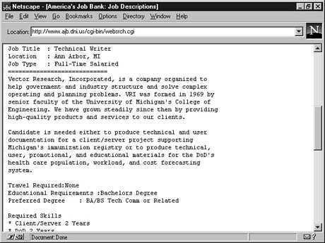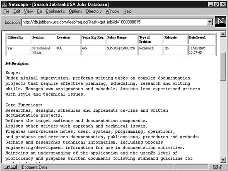 Searching for the SearchBecause there are so many resources for job locators out there, you might want to first spend some time with your good old Web search engine to build a list of guidemarks that suit your needs. For example, an Excite search for employment +search produced over 100,000 hits, many of which led to actual job locator sites. Another page you will want to guidemark is This Yahoo! directory has links to dozens of online resumé and job-location sites on the Internet. You'll want to spend some time to see which one best suits you. You'll look at a couple as test cases in the following section. America's Job BankFor the sites you are going to look at, assume that you are looking for a job as a freelance writer, a fairly common "supplemental" and primary job for many in the U.S. today (myself included). To Do: Find a Job Online1. Point your browser to http://www.ajb.dni.us/.2. Click the Job Search Index link. 3. Next, click the Keyword Search option (although you can use any of the other options, as well). 4. Now type writer in the Keyword Phrase: field. You can also restrict your search by state if you want. 5. Click the View Jobs Now button to see your jobs displayed. You probably will also want to view the jobs in groups of 100 or more to reduce the amount of paging you will have to conduct. 6. You now can place an X in the boxes of those jobs in which you are interested and then click the View Jobs button. If you want, you can sort the resulting list of jobs by salary, state, city, and other criteria. A typical job listing will look something like Figure 23.7. This is a typical job listing with America's Job Bank. 7. When you've found a job in which you are interested, scroll down and click the How To Apply button to find out how to apply for the job. JobBank USANow look for that same job at another site called JobBank USA. To Do: Try Another Online Job Resource1. Point your browser to http://www.jobbankusa.com/.2. Click the Find A Job link. 3. Next, click the Search For Jobs link. 4. Now type writer in the Keyword: field. You can fill in any of the other fields you want, but only this one is required. 5. A list of all matching available jobs will be listed. Click one to view it (see Fig- ure 23.8). Contact information for each job is provided at the bottom of each job's page. JobBank doesn't have quite the selection of America's Job Bank, but there still are a few good-paying jobs here. Job PotpourriMany people would like to have a little help in how to go about finding a job. There is a definite need to brush up on important skills and techniques when you are looking for a job. There are, of course, sites out there to help with this, as well. A very interesting as well as informative site is the Kaplan Career Center Web site at http://www.kaplan.com/career/. It offers interview simulation games, links, and an online Career Counselor and job search software. From this page, click Links to get information on just about everything you'll need to know when getting a job. Use this page, as well as the Yahoo! job categories, to find places to submit your resumé, refine your techniques, and more. Break a leg! SummaryThis lesson showed you some of the resources available for business on the Internet. You first discovered all of the resources out there for those looking to start a business for themselves. In addition, you found out that there are many ways on the Net in which to find someone else to work for, as well. You also know how people keep up with financial and business markets on the Internet by looking at Nasdaq, CNNfn, and other online market resources. WorkshopThe following workshop helps solidify the skills that you learned in this lesson. Q&AQ Is the Web the only place to get business information? A No, but it certainly is the easiest. In arenas such as business, where current information is at a premium, however, the Web really is the best place to go. The best non-Web resources for business on the Internet is Usenet. Use your newsreader to search for biz, jobs, employ, and other keywords to find appropriate newsgroups. Q I have a disability and am seeking employment. Is there anywhere for me? A The business community is just starting to see the value of disabled workers. One site to which you might want to go is The Open Door Employment and Disability Network at http://www.mrs.mjc.state.mi.us/. This site is run by a Michigan state agency dedicated to helping persons with disabilities find employment. You might find some valuable information there. Q I'm looking for temporary employment; how can I find it? A Many temporary agencies are now online, as well. A few are Manpower at http://www.manpower.com, Adia at http://www.adia.com, and Olsten at http://www.olsten.com. QuizTake the following quiz to see how much you've learned. Questions1. Which Web Site probably won't help a small business owner? (a) Small Business Association On-Line(b) IRS On-Line The Nasdaq Web Site 2. It is possible to get up-to-the-minute stock reports any time of the day. (a) True (b) False 3. Which job would you be least likely to find on the Internet? (a) Electrical Engineer (b) Technical Writer Housekeeper Answers1.2. (b) Contractual obligations prevent this. 3. Maybe some day. ActivityChoose a company in which you are interested and, using the resources covered in this lesson, develop a "portfolio" of the company, such as stock history, financial performance, general news, and anything else you can find. Hint: It would be a good idea to pick a large, national company.