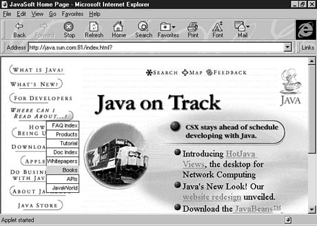 Figure 3.1. The JavaSoft Web site uses a Java program to add pull-down menus on top of a Web page.