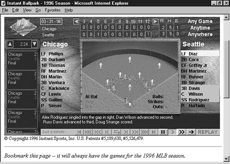The program is a unique way to follow live games and past games that are available from the Instant Ballpark archive. Figure 3.4 shows the last play in a game between the Chicago White Sox and the Seattle Mariners from the 1996 season.
