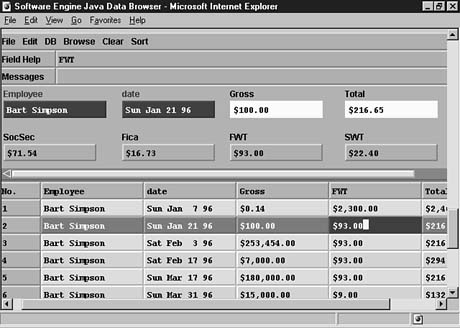 This example is an employee payroll database managed as a pair of Java programs. Employee information is viewed in one program, and the other program is used to edit items from the payroll record of a specific employee. Figure 3.5 shows Bart Simpson's record as it is being edited.