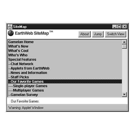 Gamelan's directory listings indicate when a compiled Java program is accompanied by the source code used to create it. After you have finished your first 24 Chapters as a Java programmer, you ought to take a look at some of these programs. Figure 3.6 shows a Java program being used on Gamelan to provide instant access to the different areas that comprise the site.