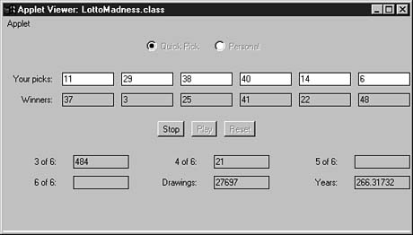 One last thing to note about the LottoMadness applet is the lack of variables used to keep track of things like the number of drawings, winning counts, and Lotto number text fields. This element of user interface programming differs from other types of programs. You can use the interface to store values and display them automatically.