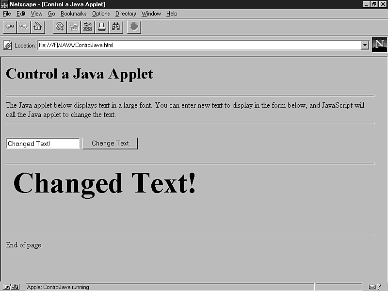 <TITLE>Control a Java Applet</TITLE>