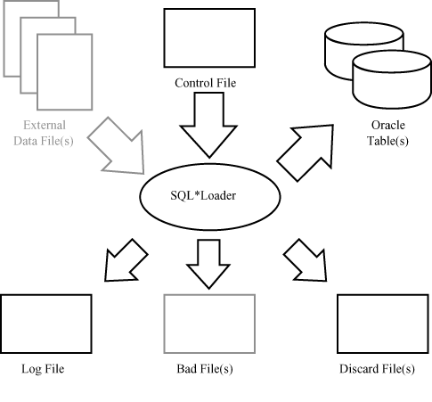 SQL*Loader requires two types of input: the external data, which can reside on disk or tape, and control information (contained in the control file), which describes the characteristics of the input data and the tables and columns to load. The outputs, some of which are optional, include the Oracle table(s), log file, bad file(s) and discard file(s). Figure 8.1 illustrates the components.