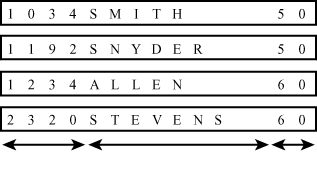 In fixed format, the data exists in fixed-length records that all have the same format. The fields for fixed-format files are defined by starting and ending positions within the record, and the fields contain the same data type and length throughout the file. (see Figure 8.2.) Binary data must be in a fixed-format file, as SQL*Loader cannot handle it in a variable format.