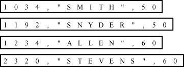 In variable-format files, the data exists in records that may vary in length, depending on the length of the data in the fields. The fields are only as long as necessary to contain the data. Fields in variable-format files may be separated by termination characters (such as commas or white space), enclosed by delimiter characters (such as quotation marks), or both. (See Figure 8.3.)