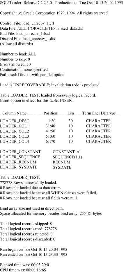 To increase performance, use fixed-length records. Based on the tests I have done, SQL*Loader takes about 50% longer to process a variable-format file than a fixed-format file. I used the same amount of data for both formats and comma separation for the variable data.