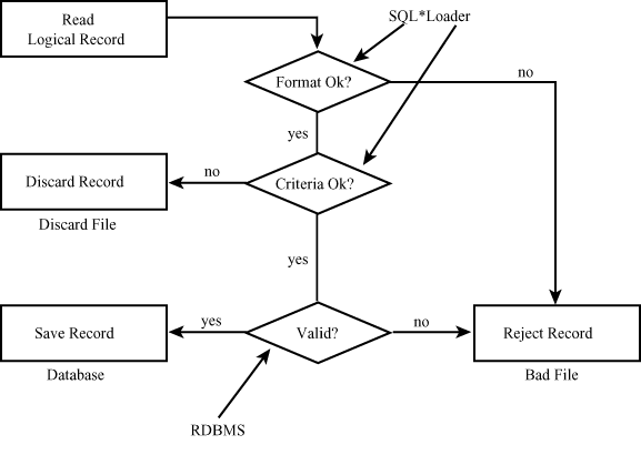 If SQL*Loader rejects the record due to a format error, or the Oracle kernel cannot insert the record into the database table(s) for any reason, the input record is written to the BAD file, in the same format as the original input data file. If SQL*Loader rejects the record due to an exclusion based on the record-selection criteria, the input record is written to the DISCARD file (providing it was specified in the control file), also in the same format as the original input data file. Because both the BAD and DISCARD files are written in the same format as the original input data file, they can be edited, if necessary, and used as input data files to another SQL*Loader session.