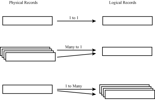 Physical records are the individual lines in the input data file as they were created by the operating system on the platform from which the file originated. Physical records are terminated by a record-terminator character (like a carriage return). Logical records correspond to a row in a database table. A physical record can have a one-to-one association with a logical record. (See Figure 8.6.) SQL*Loader also enables you to create a many-to-one association between physical and logical records through the use of the CONCATENATE or CONTINUEIF clause in the control file. You may create a one-to-many relationship by splitting one physical record into multiple logical records.