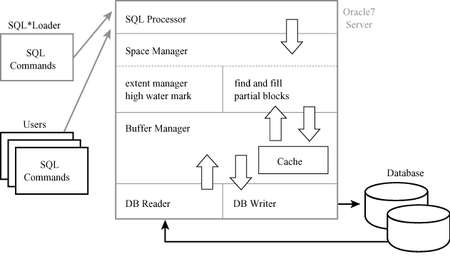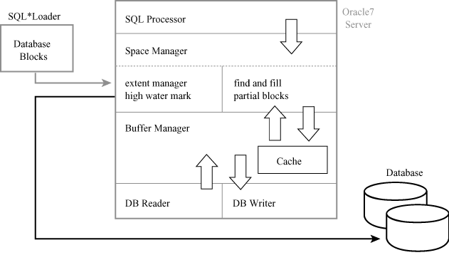 The conventional path generates a SQL INSERT command with the array processing interface to load the data into the table(s). Because of this interface, SQL*Loader competes with all other Oracle processes for buffer cache resources; Oracle looks for and tries to fill partially filled blocks on each insert. (See Figure 8.7.) If you are loading small amounts of data, this method is usually acceptable; however, with large volumes of data, this technique becomes too time consuming and resource-intensive.
