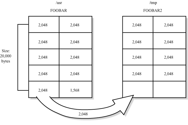 In Figure 14.1, the file FOOBAR is 20,000 bytes (a little less than 20K). Assuming that the operating system copies in 2,048-byte (2K) blocks, it can successfully copy the file in 10 packets. Compare this with Figure 14.2.