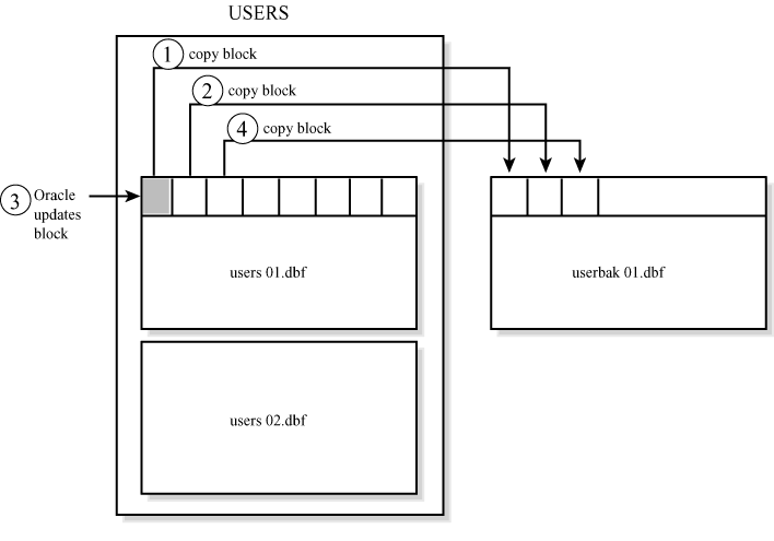 When you place a tablespace in backup mode, the Oracle instance notes that a backup is being performed and internally compensates for it. As you know, it is impossible to make an authentic copy of a database file that is being written to. On receipt of