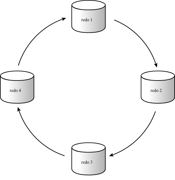 its previous, consistent state. It uses the redo logs cyclically, as shown in Figure 14.3.