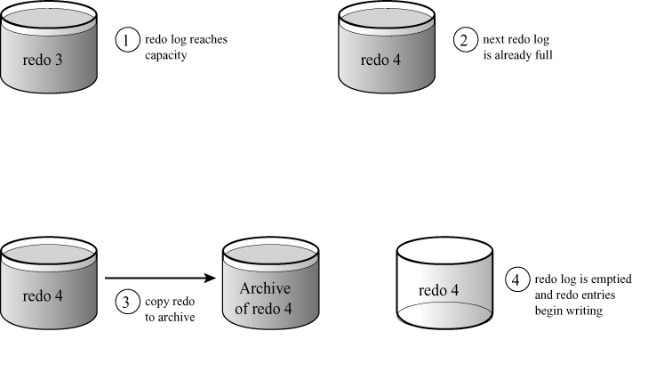 previous cyclewhich is true in all cases except the first cyclean offline copy of the redo log is made. Once this copy is made, the redo log is emptied and the database resumes its normal processing by writing information to the redo log. This
