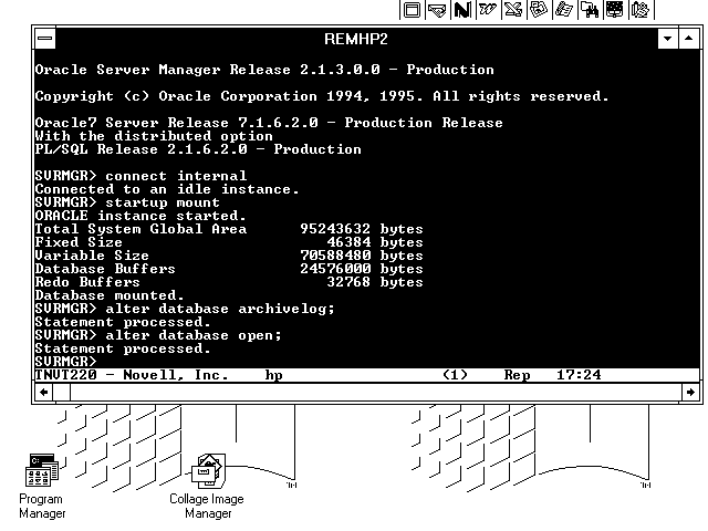 % svrmgrl SVRMGR> connect internal Connected to an idle instance SVRMGR> startup mount ORACLE instance started Total System Global Area 95243632 bytes Fixed Size 46384 bytes Variable Size 70588480 bytes Database Buffers 24576000 bytes Redo Buffers 32768 bytes Database mounted. SVRMGR> alter database archivelog; Statement processed. SVRMGR> alter database open; Statement processed.