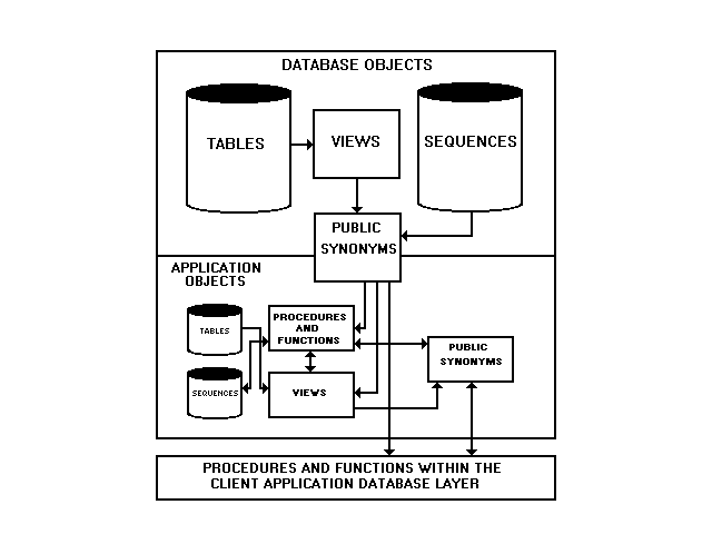The application itself communicates with application-specific objects in the database through public synonyms. Stored procedures and functions operating on views are used exclusively for transaction processing, and views are used to retrieve all result