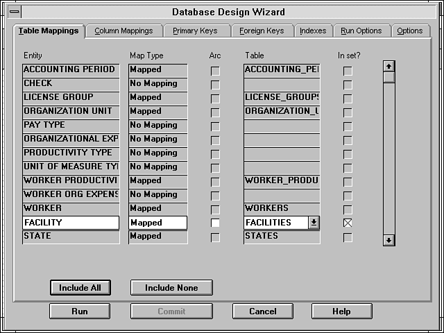 The first screen that appears is the Table Mappings tab (see Figure 27.1). It contains all the entity names, whether they have been mapped to a table, and the table name. If you want to generate or regenerate an entire entity into a table, select the In